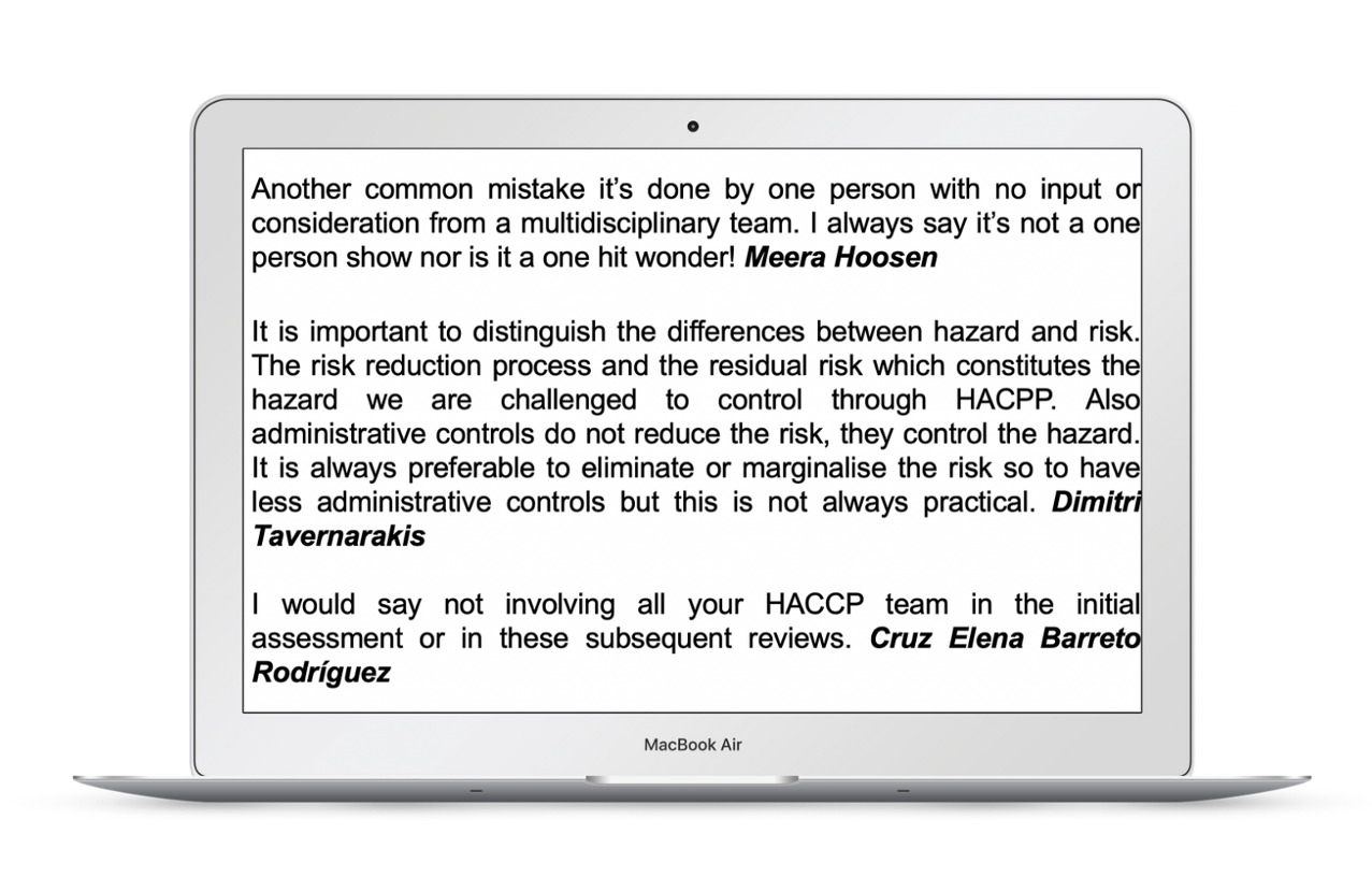 One final note to the importance of the entire multi-disciplinary HACCP team working on the Hazard Assessment and when necessary, invite other personnel from different areas. For example, this is relevant when the need to change or substitute an ingredient and/or the origin of an ingredient arises. Having a multidisciplinary HACCP team is very important because even though most Hazards and HACCP knowledge may be on the food safety professional, it is crucial the contribution of other members for the all team to gain knowledge of aspects such as personnel, processes, and equipment.